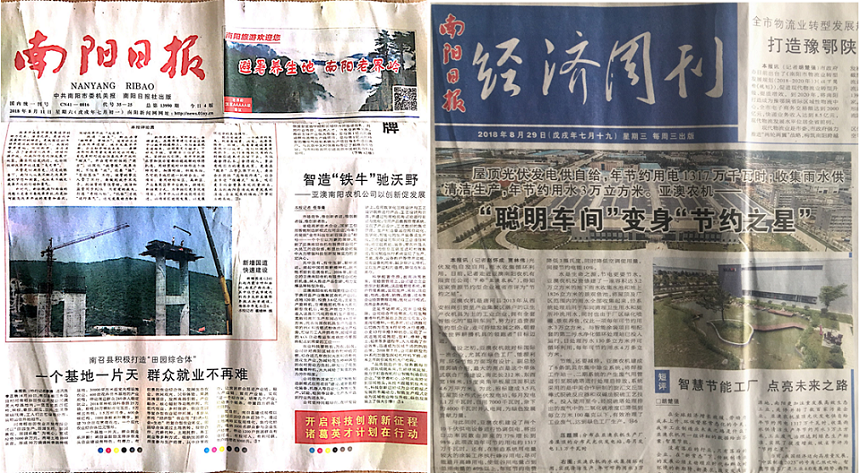 從智能制造到清潔生產(chǎn)、節(jié)能減排,一月內(nèi)《南陽日?qǐng)?bào)》于811日、、829日連續(xù)兩次報(bào)道亞澳農(nóng)機(jī),河南衛(wèi)視《新聞聯(lián)播》聯(lián)動(dòng)報(bào)道。